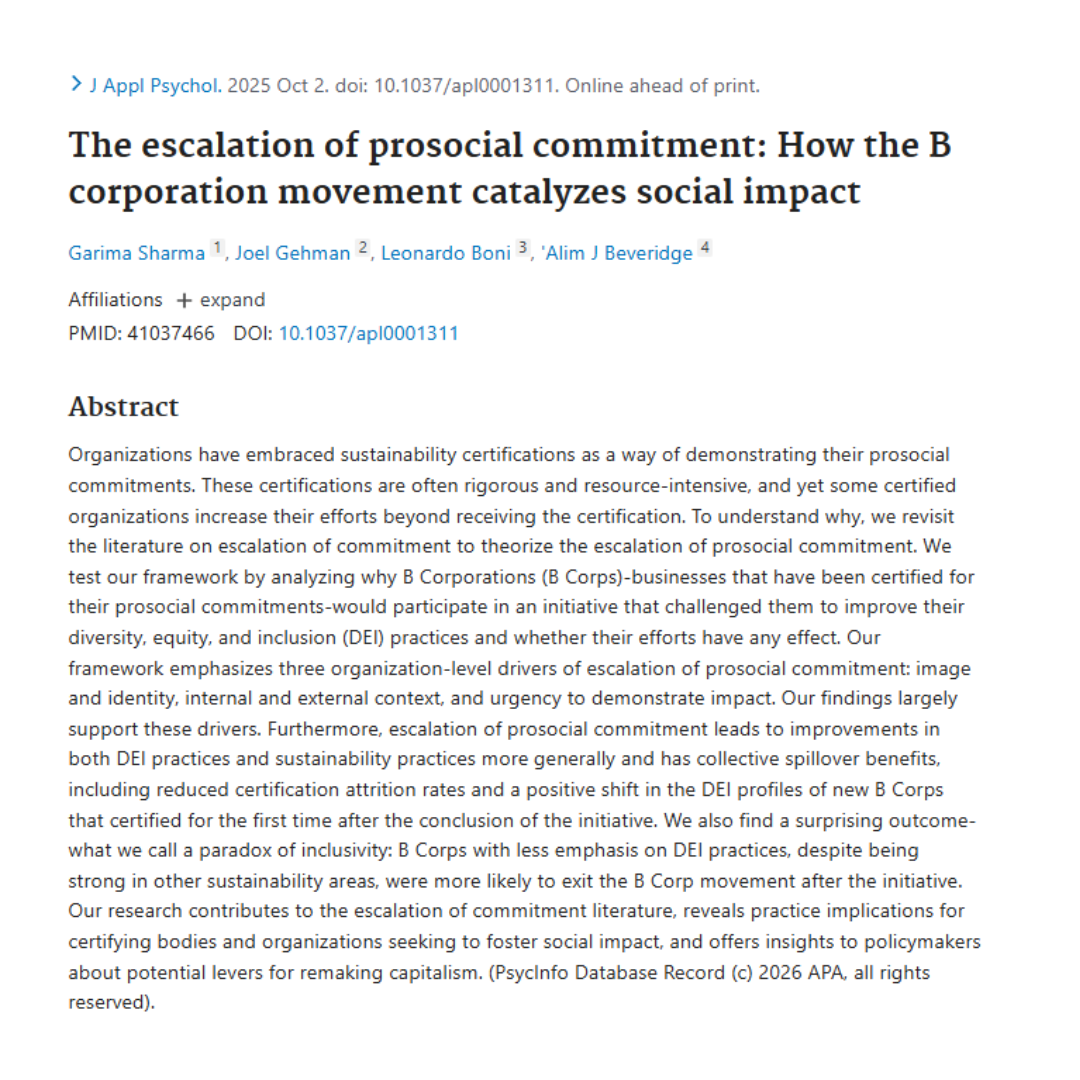 Congratulations to Garima Sharma, Joel Gehman, Leonardo Boni and Alim J. Beveridge for their impactful research “The escalation of prosocial commitment: How the B corporation movement catalyzes social impact.”This groundbreaking research, recently featured in the Journal of Applied Psychology, explores why B Corps continue to push their social and environmental limits even after achieving the ‘gold standard’ of certification. By analyzing the Inclusive Economy Challenge, the authors identified key drivers—like organizational identity and the urgency for impact—that lead to significant improvements in DEI and general sustainability practices. Their work not only offers deep insights into the ‘stickiness’ of the B Corp movement but also provides a vital framework for policymakers and organizations looking to truly remake capitalism. Congratulations to this incredible team of researchers!